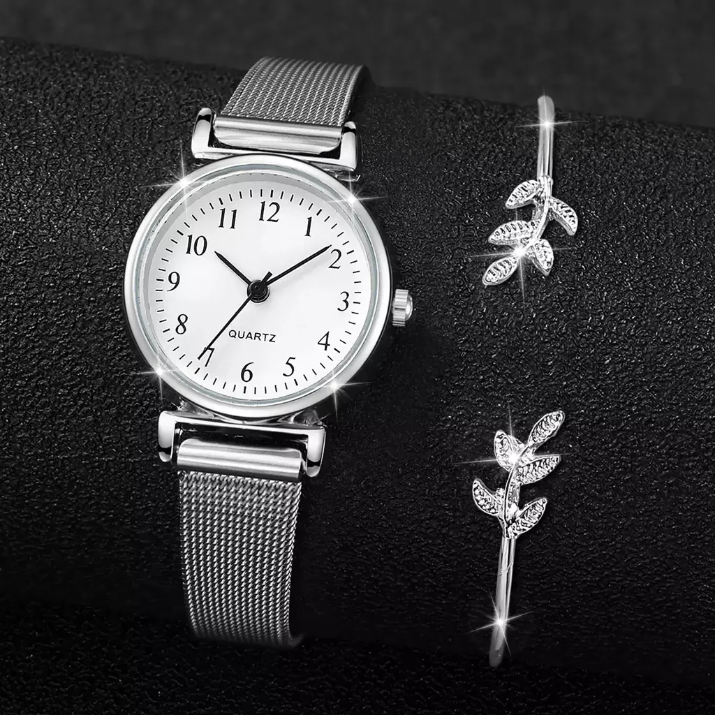 Conjunto Versátil: Inclui relógio de quartz preciso e bracelete cuff em aço, permitindo diferentes combinações de estilo.