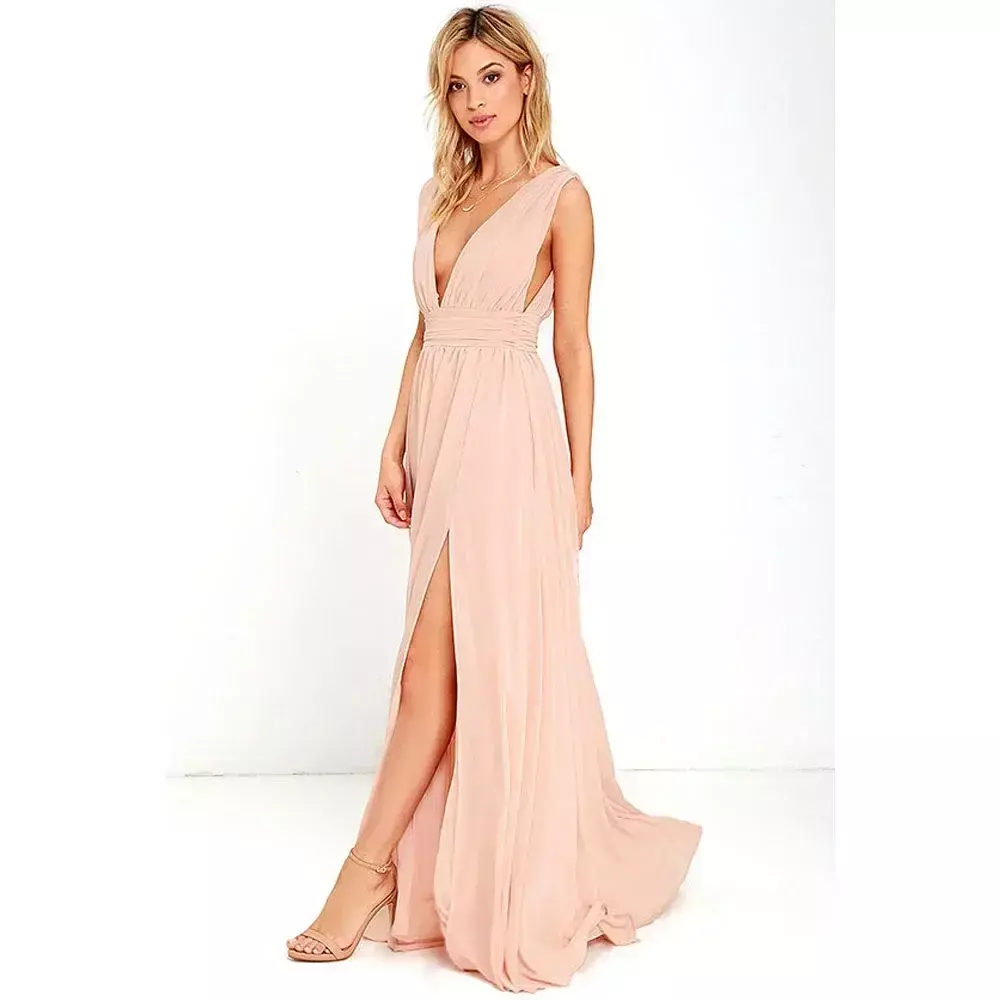 Seu design com decote em V e costas delicadamente abertas traz uma sensualidade sutil e refinada — ideal para eventos especiais, jantares elegantes,celebrações sob o pôr do sol ou até mesmo como vestido de dama de honra.